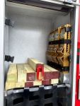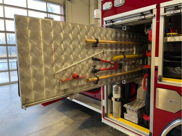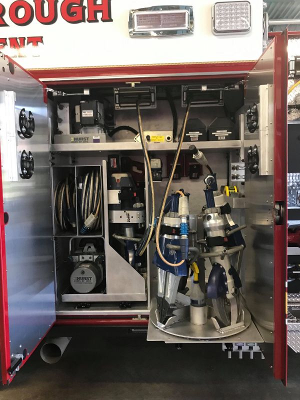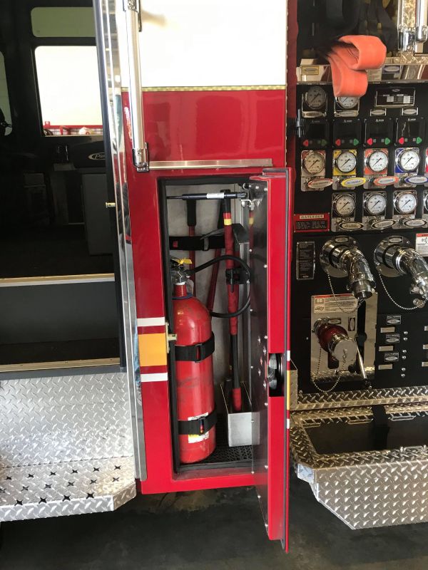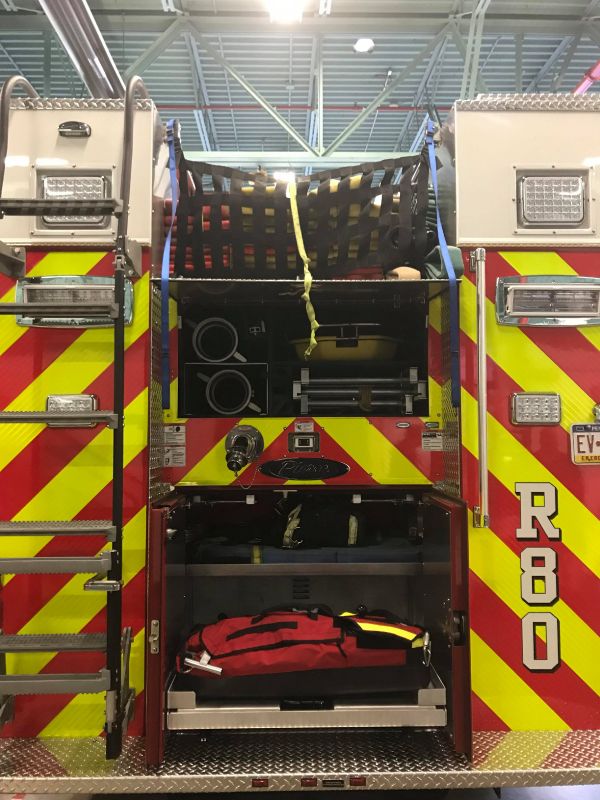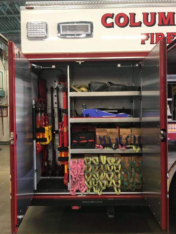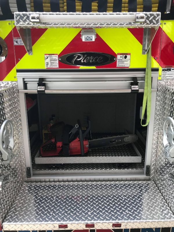 Aluminum rescue body with full depth rescue compartments and aluminum roll-up doors, compartments have roll-out trays
